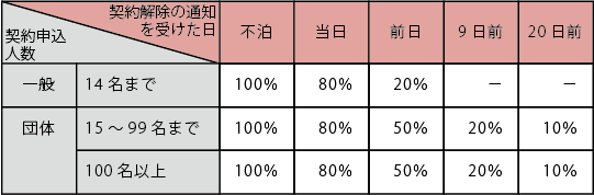 3. 団体客 (15名以上) の一部について契約の解除があった場合、 宿泊の10日前(その日より後に申込みをお引き受けした場合にはそのお引き受けした日)における宿泊人数の10%(端数が出た場合には切り上げる。 ) にあたる人数については違約金はいただきません。